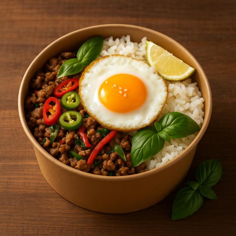 Une recette Thaïlandaise très populaire, sur une base de riz Thaï, du porc haché et sauté avec du piment, du basilic, des poivrons et agrémenté d’oeuf au plat.